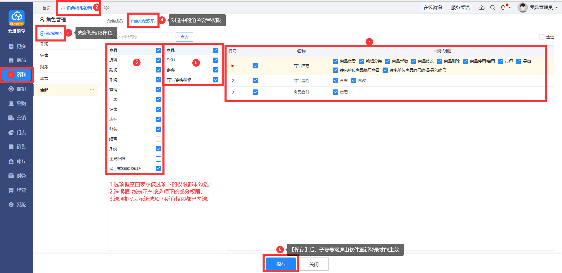 注意:给子账号设置好权限后,需要该子账号重新登录一次软件,才能执行新的权限
